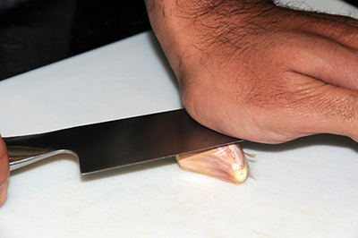 3. Place a large wide knife (such as a chef’s knife) horizontally over the clove. Using the heel of your hand, press the knife down firmly (but not too hard) onto the garlic clove. The garlic should crack a bit, making it easy to remove the skin.