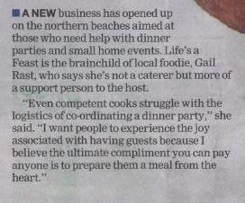 life’s a feast received a nice piece of publicity in local newspaper, The Manly Daily, on Friday 19th September.  The article states: “life’s a feast is the brainchild of local foodie, Gail Rast, who says she’s not a caterer but more of a support person to the host.”